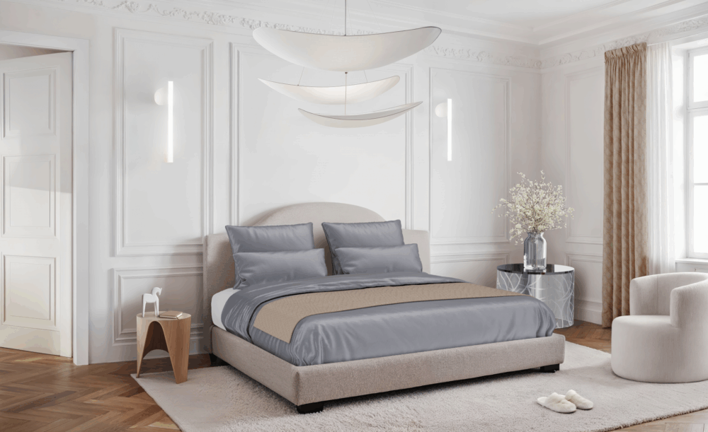 Комплект постельного белья из плотного и легкого мако-сатина (100% Египетский хлопок), нежно касается кожи, хорошо пропускает воздух и сохраняет тепло. Никакого дискомфорта, сползания и статического электричества — только спокойный глубокий сон. Подходит для любого климата и сезона — поддерживает оптимальную температуру и влажность.