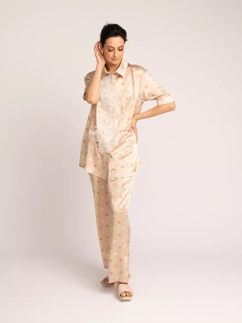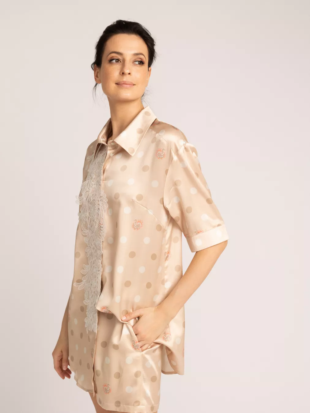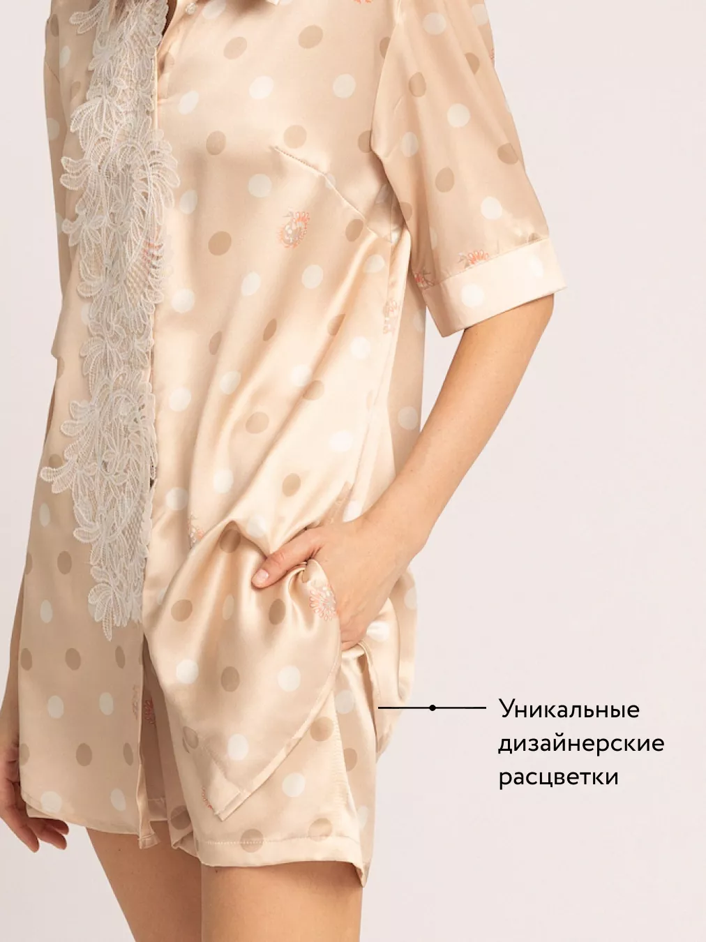 Женская рубашка в натуральных песочно-бежевых цветах фирменной палитры Mollen. Цвета разработаны специально для коллекции Сказки, ведущими колористами России. Рисунок на ткани — блестящий образец современного дизайна, созданный по мотивам древнего славянского орнамента. Рубашка из прочного роскошного шелка идеальна для дома, она не стесняет движений, приятно касается кожи и радует глаз спокойным природным цветом. Пуговицы изготовлены под цвет ткани, но не сливаются с фоном, а гармонично вписываются в композицию узора. Шелк позволяет коже дышать и поддерживает оптимальную температуру. Изящное кружево, украшающее переднюю часть рубашки – стилистическая отсылка к домашним платьям русских аристократок.